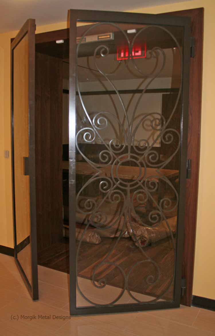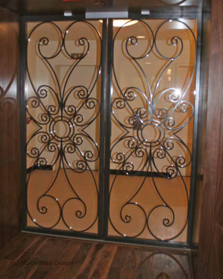 Custom wrought iron entry gate for commercial office with tempered glass and magnetic release. Finish; custom brown paint